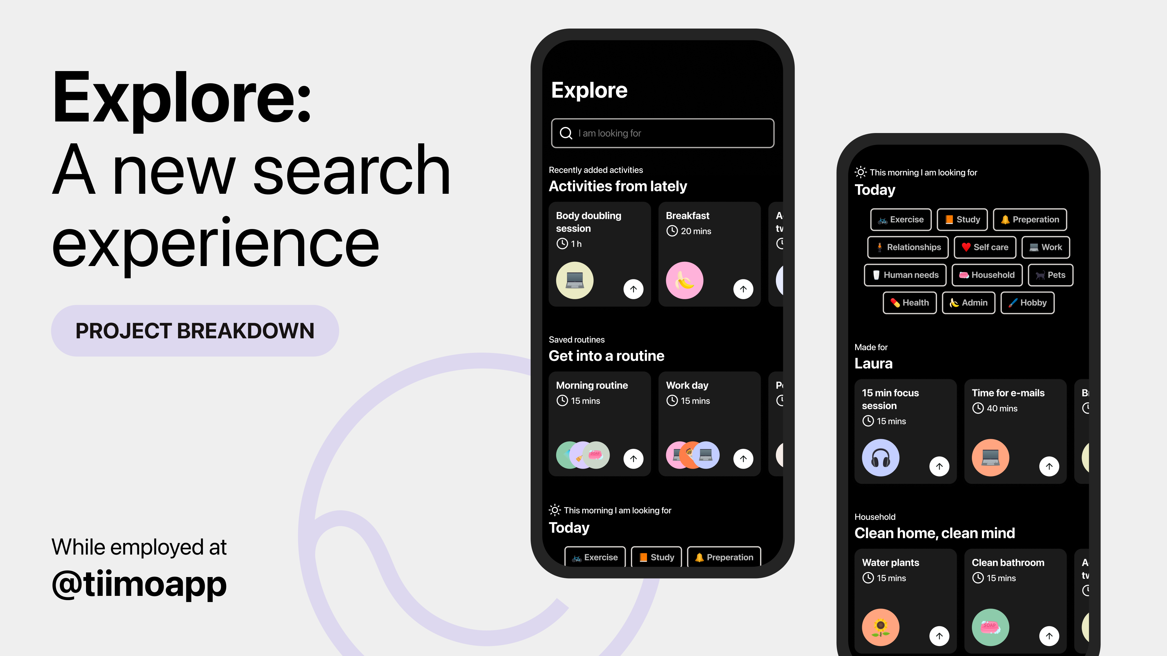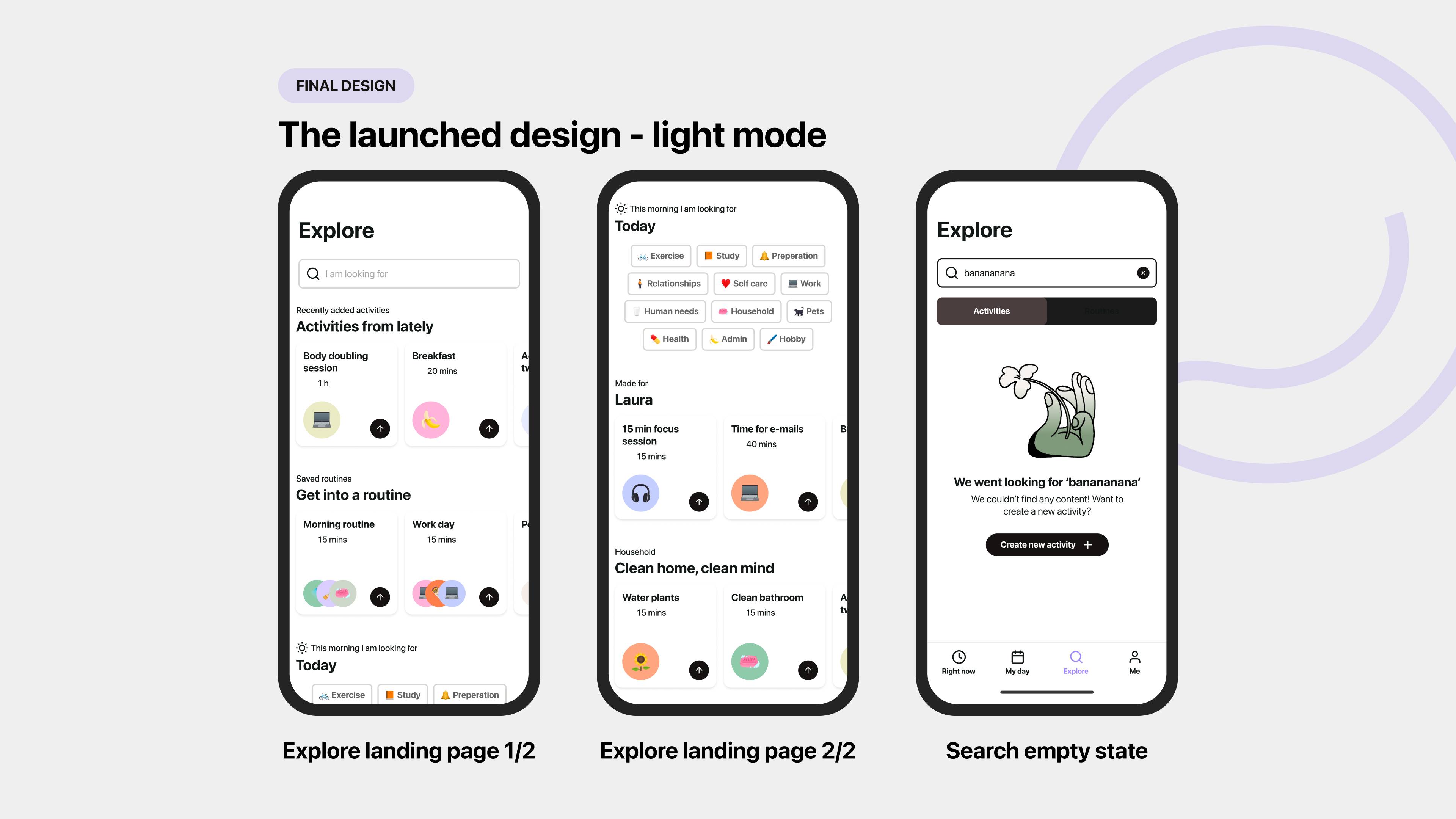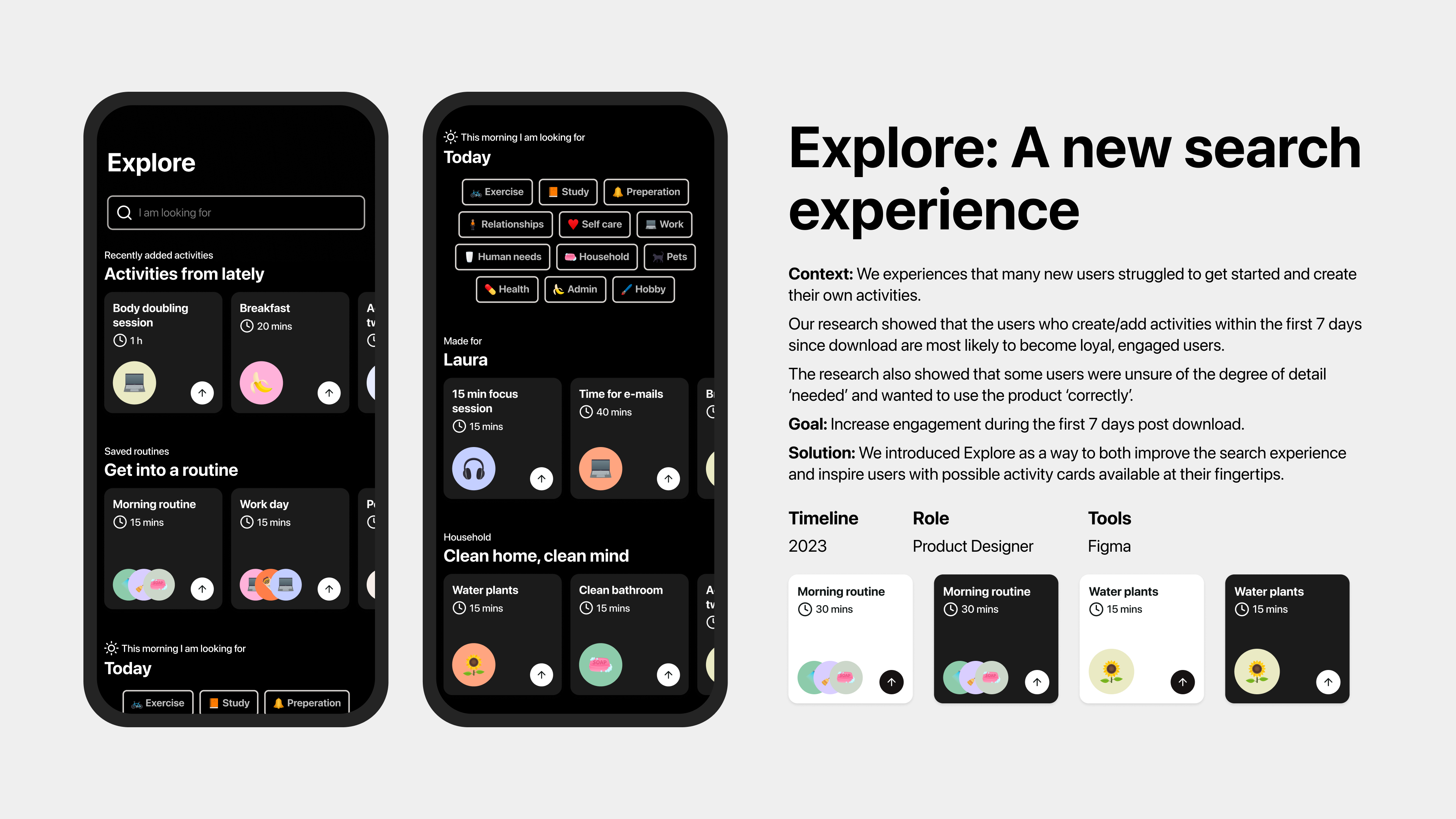 We experiences that many new users struggled to get started and create their own activities. Our research showed that the users who create/add activities within the first 7 days since download are most likely to become loyal, engaged users. The research also showed that some users were unsure of the degree of detail ‘needed’ and wanted to use the product ‘correctly’. Goal: Increase engagement during the first 7 days post download. Solution: We introduced Explore as a way to both improve the search experience and inspire users with possible activity cards available at their fingertips.