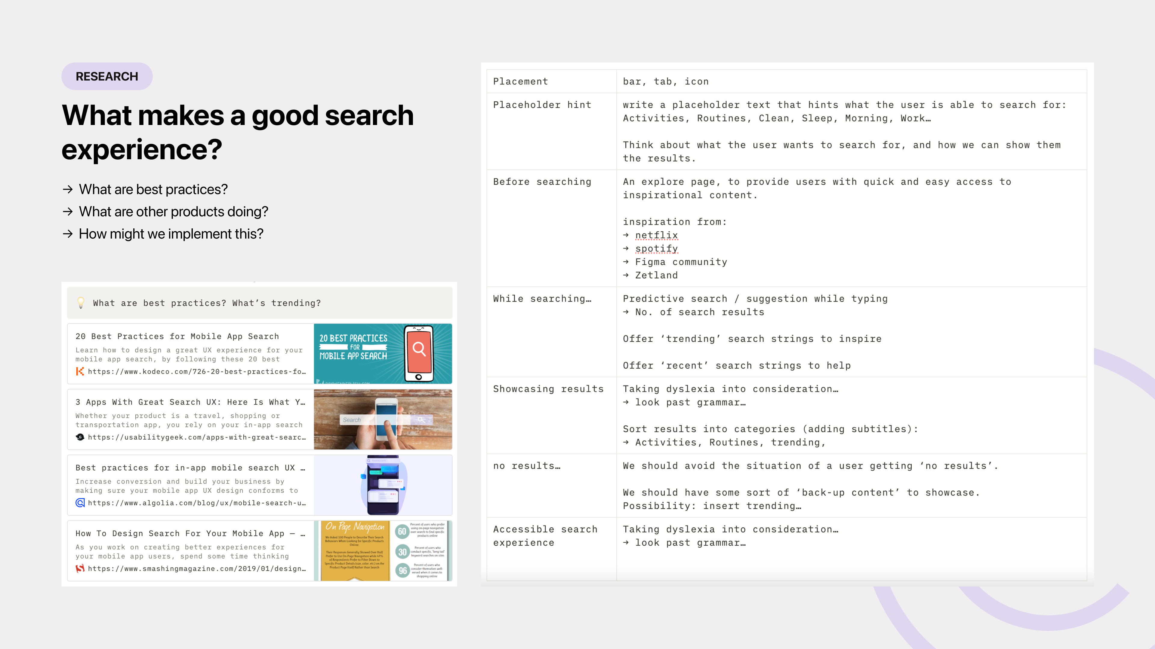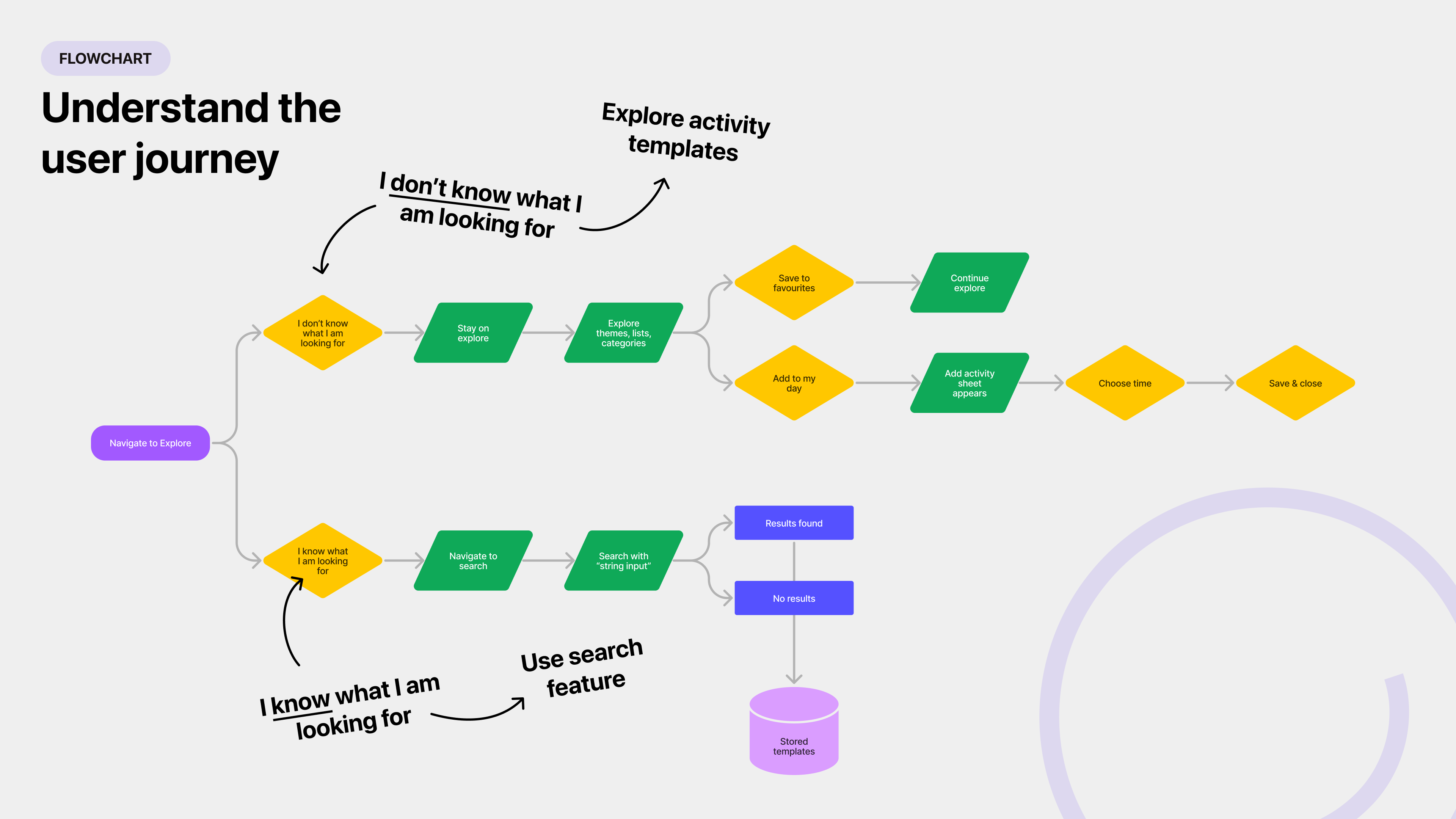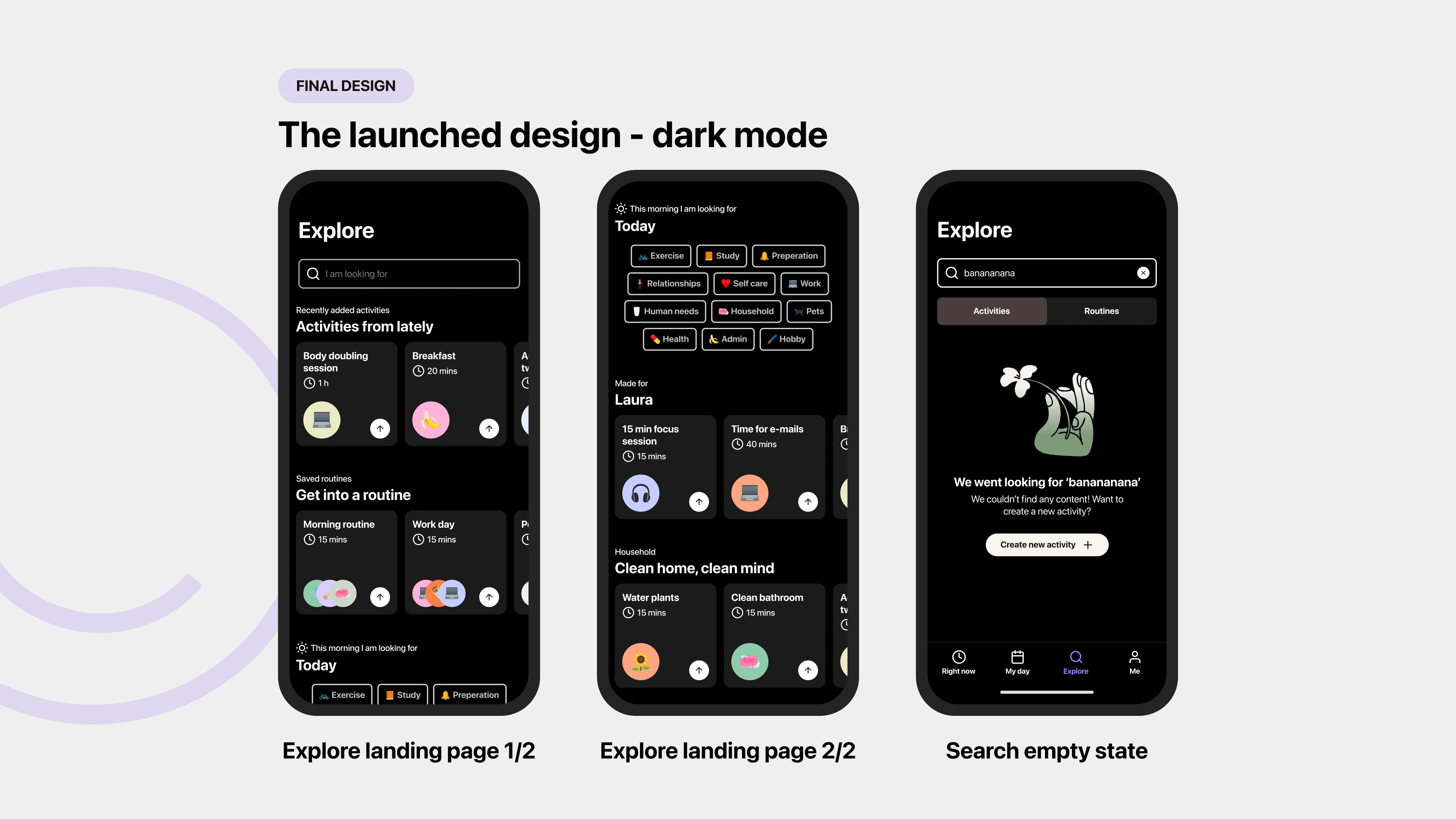 We experiences that many new users struggled to get started and create their own activities. Our research showed that the users who create/add activities within the first 7 days since download are most likely to become loyal, engaged users. The research also showed that some users were unsure of the degree of detail ‘needed’ and wanted to use the product ‘correctly’. Goal: Increase engagement during the first 7 days post download. Solution: We introduced Explore as a way to both improve the search experience and inspire users with possible activity cards available at their fingertips.